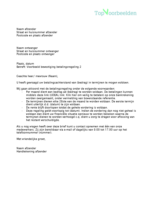 Betreft: Voorbeeld bevestiging betalingsregeling 2