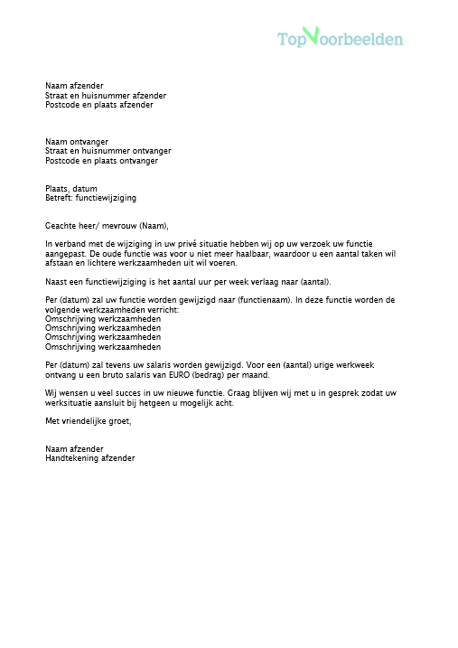 Brief functiewijziging, 3 voorbeeld brieven voor het wijzigen van een functie. Er kunnen diverse redenen zijn om een functie te wijzigen. De meest voorkomende reden is een verbetering van de functie, de werknemer promoveert. Het kan ook zo zijn dat de werknemer wegens een privé situatie minder wil gaan werken of minder zware taken wil uitvoeren. Daarnaast is er bijvoorbeeld in het onderwijs voor bepaalde functies een vereiste om door te blijven leren. Wanneer dit niet gebeurd kan men terug gaan naar een oude functie. Bekijk hieronder 3 voorbeeld brieven voor de verschillende situaties.