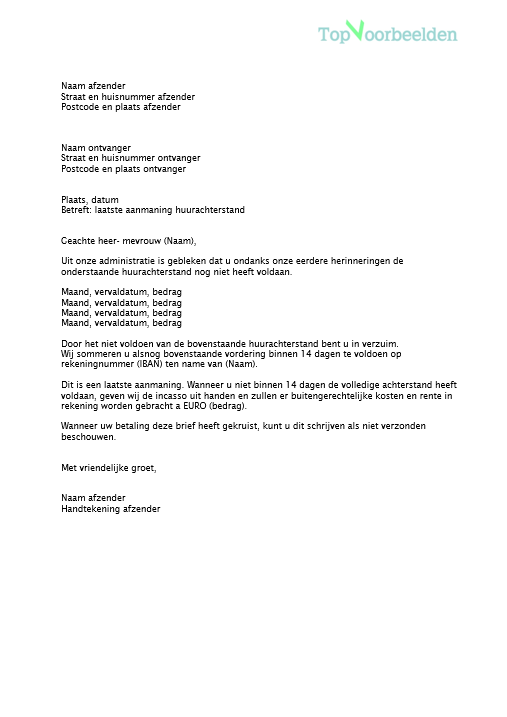 Wanneer de huurachterstand niet binnen (aantal) dagen op onze rekening staat, zien wij ons genoodzaakt om een incassotraject te starten. Aan dit traject zijn kosten verbonden, welke bij u zullen worden verhaald. Wij hopen dat het zover niet hoeft te komen en u binnen de genoemde tijd de achterstand voldoet.