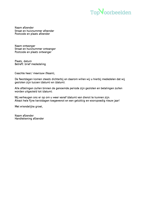 daarom willen wij u hierbij mededelen dat wij gesloten zijn tussen (datum) en