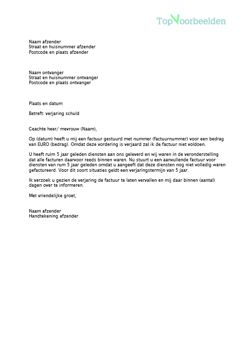 Brief verjaring schuld, voor wanneer je een factuur ontvangt waarvan de vordering is verjaard. Voor producten geldt een verjaringstermijn van 2 jaar en voor diensten een verjaringstermijn van 5 jaar. Bekijk en download de gratis voorbeeld brieven.