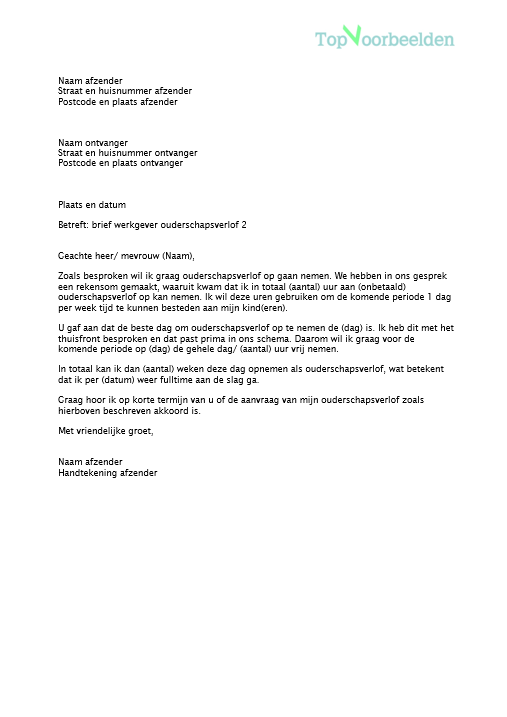 Brief werkgever ouderschapsverlof, 3 voorbeeld brieven om ouderschapsverlof aan te vragen bij je werkgever. Bekijk en download de gratis voorbeelden.