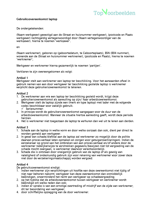 Werkgever stelt aan werknemer een laptop ter beschikking. Voor het aanvaarden ofwel in gebruik nemen van een door werkgever ter beschikking gestelde laptop is werknemer verplicht deze gebruikersovereenkomst te tekenen.