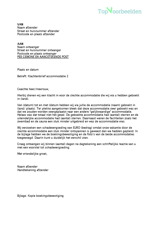 Klachtenbrief accommodatie, 2 voorbeeld klachtenbrieven voor het reisbureau bij een slechte accommodatie. Bekijk en download de gratis voorbeelden.