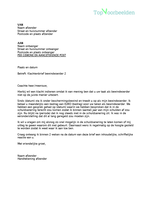 Klachtenbrief bewindvoerder, 2 voorbeeldbrieven om een klacht in te dienen tegen een bewindvoerder. Bekijk en download de gratis voorbeelden.