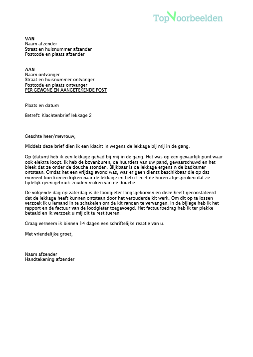 Klachtenbrief lekkage, 2 voorbeeld brieven om een klacht in te dienen in verband met een lekkage. Bekijk en download de gratis voorbeelden.