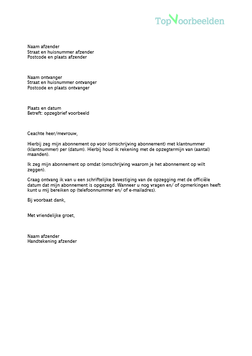 Opzegbrief opbouw, de opbouw van een opzegbrief is in principe gelijk aan elke andere zakelijke brief. Het is van belang om duidelijk je abonnementnummer of kenmerk in de brief te vermelden. Daarnaast is het van belang om aan te geven per wanneer je wilt opzeggen. Bekijk voor de opzegtermijn het contract, de algemene voorwaarden of de website van de leverancier.