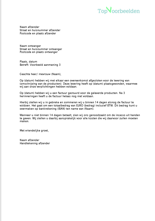 Hierbij stellen wij u in gebreke en sommeren wij u binnen 14 dagen alsnog de factuur te voldoen. Het gaat om een totaalbedrag van EURO (bedrag) inclusief BTW. Dit bedrag kunt u overmaken op bankrekening (IBAN) ten name van (Naam).