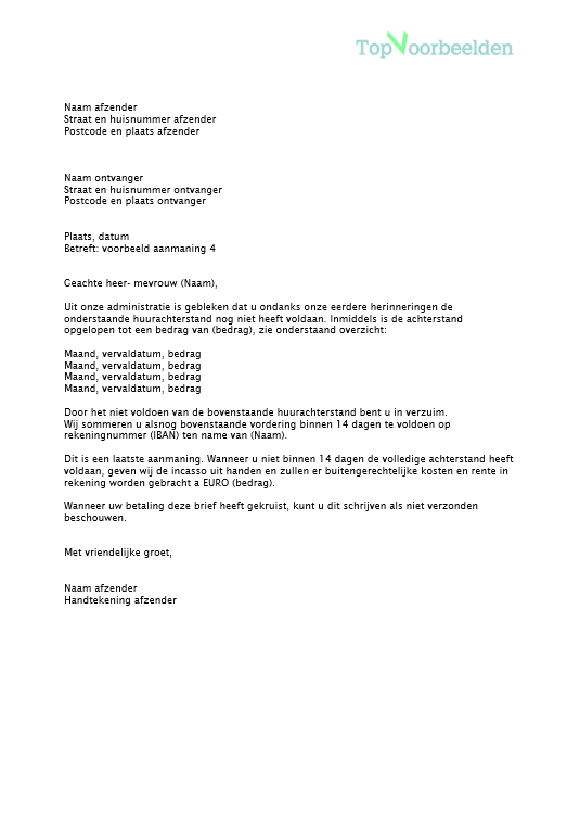 Dit is een laatste aanmaning. Wanneer u niet binnen 14 dagen de volledige achterstand heeft voldaan, geven wij de incasso uit handen en zullen er buitengerechtelijke kosten en rente in rekening worden gebracht a EURO (bedrag).